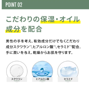 メンズコスメで日本初となる「ヘパリン類似物質」を配合したハンドクリームです。ヘパリン類似物質は、肌を整えて潤いを保つ働きがあり、乾燥改善に効果が期待できる有効成分として知られています。