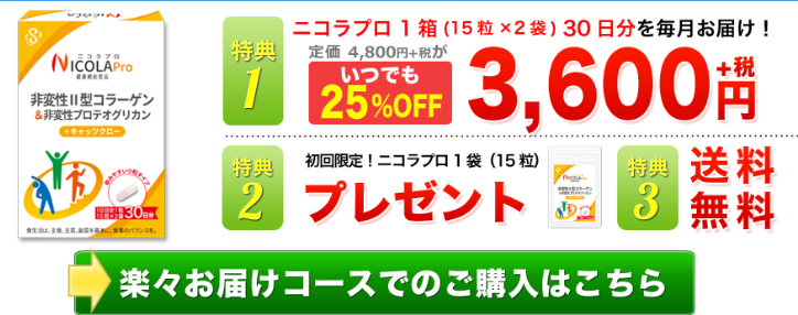 継続的なケア 関節の健康維持には継続的なケアが欠かせません。ニコラプロは毎日手軽に摂取できるサプリメント形式なので、無理なく習慣化できます。