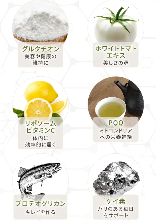VITAFLAVINは、5-デアザフラビンを中心に、医師・管理栄養士が厳選した複数の成分を配合しています。主な成分として、グルタチオン酵母、PQQ(ピロロキノリンキノン)、ホワイトトマト抽出物、水溶性ケイ素、プロテオグリカン、リポソームビタミンC、などが含まれています。
