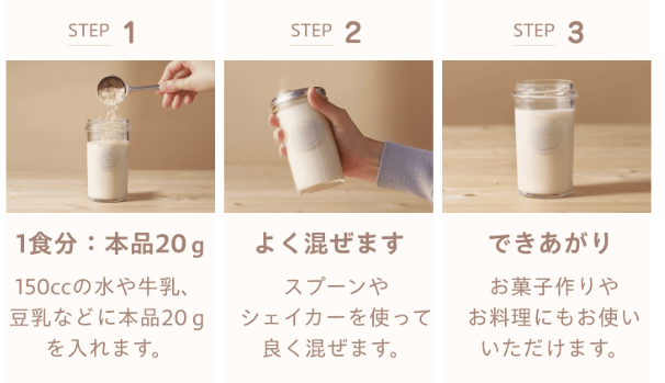 水や牛乳、豆乳など150ccに本品20gを混ぜるだけ。